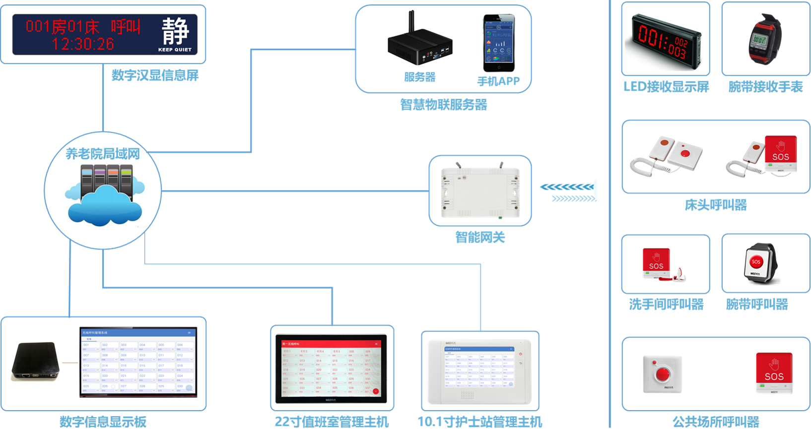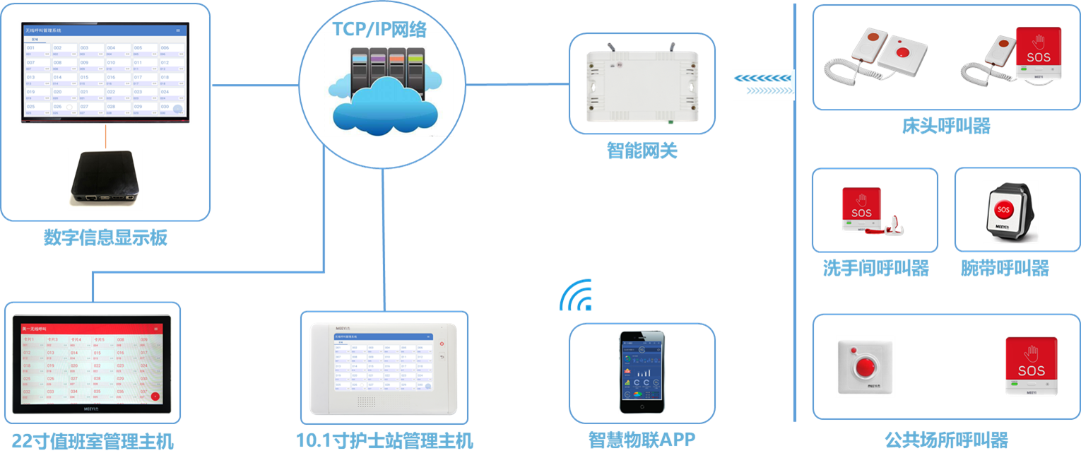 无线管理主机、智能网关、无线呼叫器、数字点阵信息屏、无线LED显示屏、无线腕带手表、智慧物联服务器、智慧物联APP及相关配件。